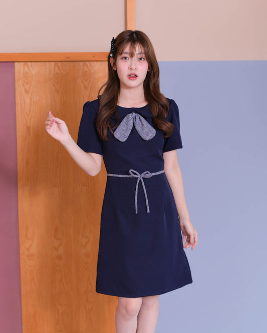 Esther Dress - 拼色小蝴蝶結領口連身裙- Navy 深藍色 (CB693)